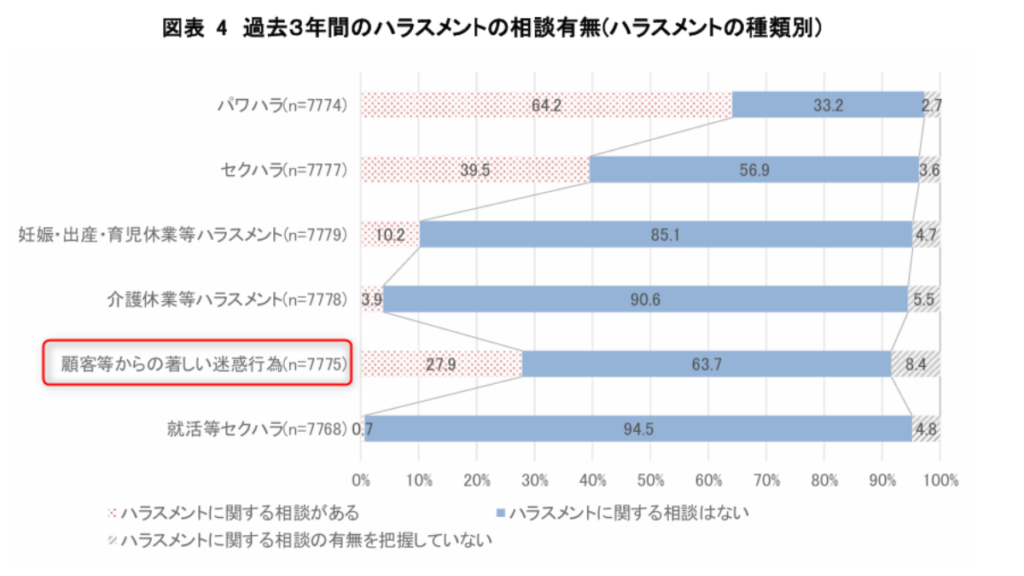 直近の調査では「過去3年間にあったハラスメントの相談件数」は、パワハラ、セクハラに次いで、「顧客等からの著しい迷惑行為(カスハラ)」が多くなっています。